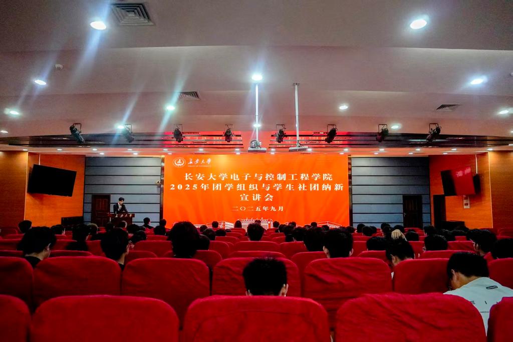 9月16日中午,长安大学电子与控制工程学院2025年团学组织与学生社团纳新宣讲会在北辰楼会议中心二楼报告厅举行。学院团委副书记胡佳瑞,2025级新生辅导员孙超、吴耀东,团学组织与学生社团主席,2025级本科新生参加会议,会议由学院学生会执行主席张子涵主持。