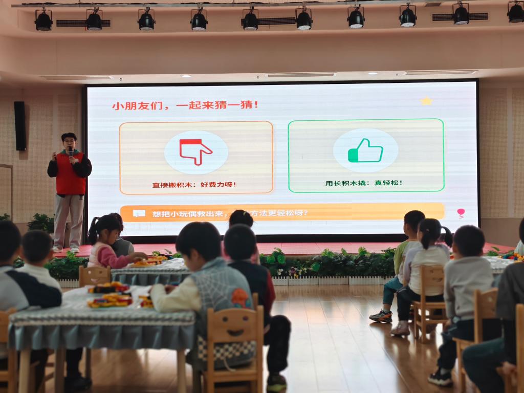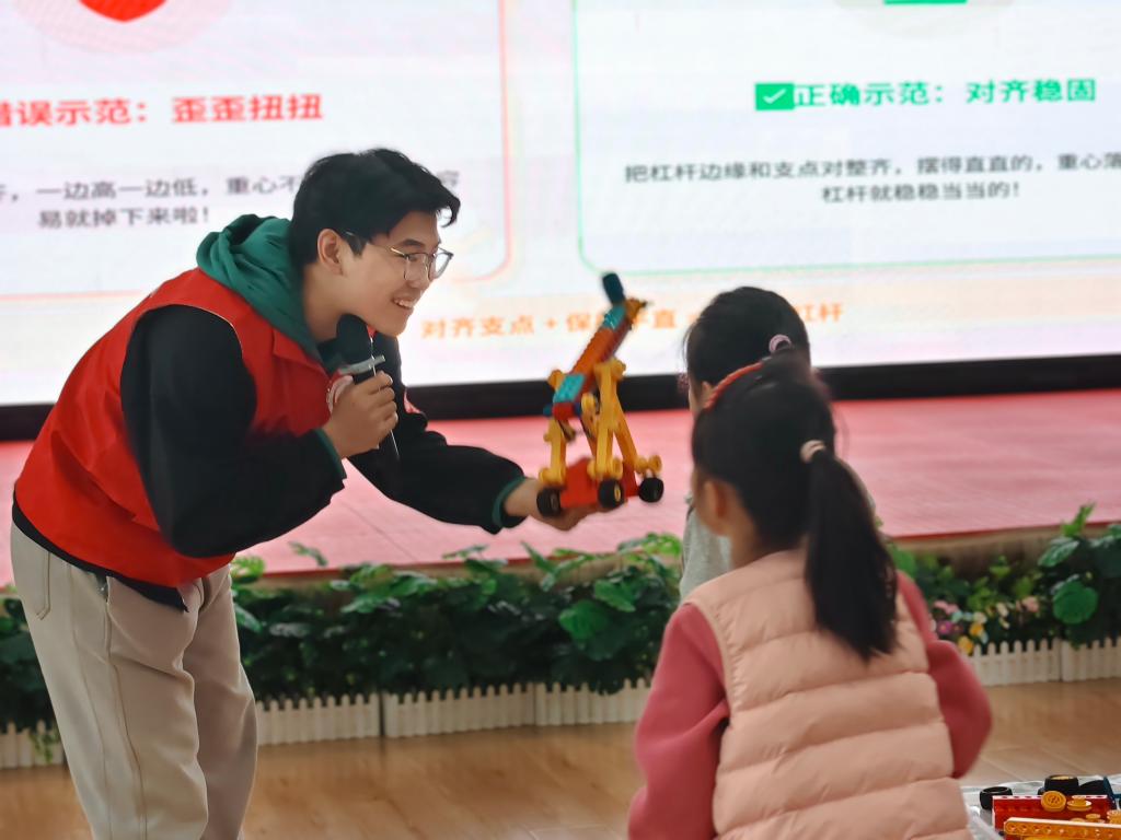技巧学习环节,志愿者重点讲解选长条积木做杠杆、选厚方积木做牢固支点、杠杆与支点对齐摆直三个搭建要点,通过正误对比示范,让孩子们快速掌握稳固结构的关键。