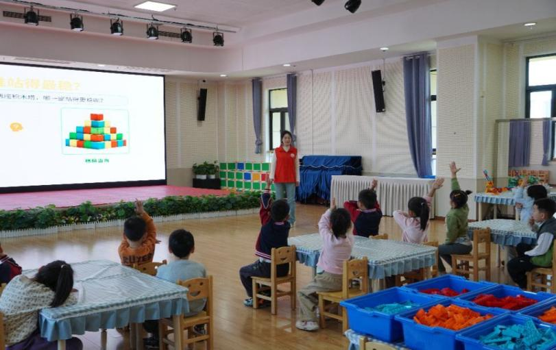 在结构特点讲解环节,志愿者用浅显易懂的语言,引导小朋友们讲出自己对于稳定结构的理解,强调搭建要点,帮助孩子掌握正确方法,为后续实践打下基础。