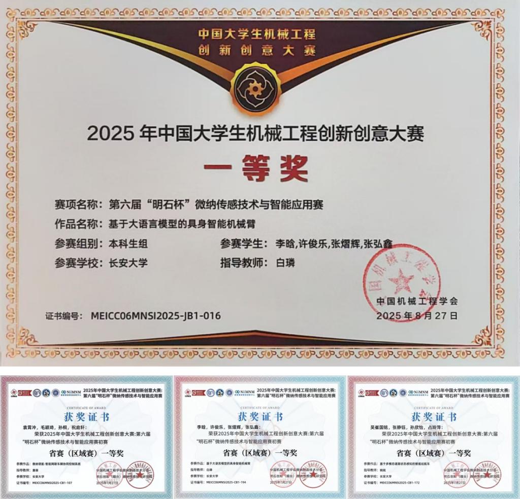 电子与控制工程学院白璘副教授指导的李晗、许俊乐、张熠辉、张弘鑫团队以“基于大模型的具身智能机械臂”为主题开发了一款集成了大语言模型的智能机械臂。作品围绕人工智能技术发展现状调研、关键技术攻关和硬件系统搭建,形成了完整的实施路径,并提出了大语言模型前端部署等关键问题的解决方案。凭借突出的技术创新与工程实现能力,团队赢得了专家评委的一致高度评价,最终斩获全国一等奖。我院惠萌教授指导的袁霄冲团队和姚锐老师指导的吴崔国铭团队分获陕西省一等奖。